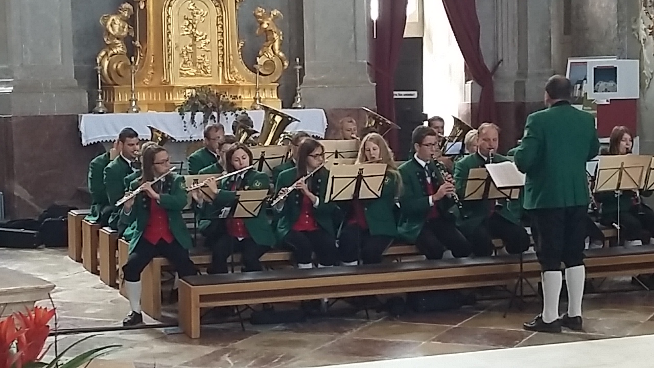 Kaum waren die letzten Töne der Musikantenhochzeit verklungen, stand für den Musikverein bereits die nächste Ausrückung am Programm. Die Pfarrwallfahrt auf den Sonntagberg fand bei sehr durchwachsenem Wanderwetter statt, dennoch intonierten die Musikerinnen frisch und froh die Deutsche Messe von Franz Schubert in einer Bearbeitung von Hans Peter Manser.